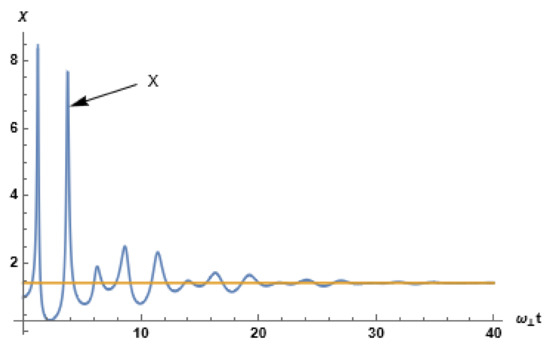 As can be seen from Equations (16)–(18), the oscillating widths are described by coupled nonlinear damped oscillator equations. The nonlinearity, which appears on the right-hand side of the equations, arises from the repulsive interaction terms due to the polytropic pressure and the collective force described by the self-consistent interaction b). These repulsive effects are counterbalanced by the effective harmonic force ∼. The system (16)–(18) generalizes the results obtained previously in [15]. In the following, we restrict ourselves to (periodic oscillations), which can be satisfied by standard MOT parameters, and we also take for the sake of illustration, which corresponds to the usual tridimensional adiabatic coefficient.