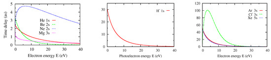 - Kheifets, A.S. Time delay in valence-shell photoionization of noble-gas atoms. Phys. Rev. A 2013, 87, 063404. [Google Scholar] [CrossRef]