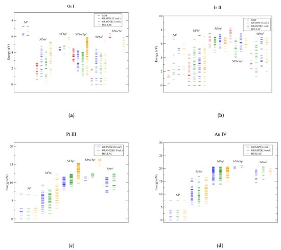 Our goal is to provide additional large-scale, but reliable, atomic line lists for Re-Pt (). Thus atomic data, such as wavelengths, spectroscopic labels, and transition probabilities are needed. While there are many computational methods based on perturbation or variational theory that could be adopted, we focus on general multiconfiguration variational methods where the wave function for an atomic state is determined in terms of a basis of configuration state functions (CSFs). In particular, the multiconfiguration Dirac–Hartree–Fock (MCDHF) method with Breit and quantum electrodynamics (QED) corrections [10] as implemented in the General purpose Relativistic Atomic Structure Package (GRASP) [11,12] is adopted. This fully relativistic code constructs and diagonalizes a Dirac–Coulomb Hamiltonian to produce relativistic orbitals, which are then used in a multiconfiguration Dirac–Fock calculation. Despite GRASP0 and GRASP2K calculations often having smaller configuration sets than those possible with other codes, we note that the underlying method is considered to be of high accuracy, allowing for accurate energies for complex species such as those considered here. In addition, a large number of lines are produced from the calculations presented, with more than 69,000 E1 and M1 transitions for each ion considered here.