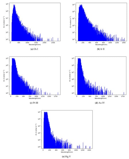 Transition probabilities (E1) for (a) Os I, (b) Ir II, (c) Pt III, (d) Au IV, and (e) Hg V obtained from GRASP2K calculations.