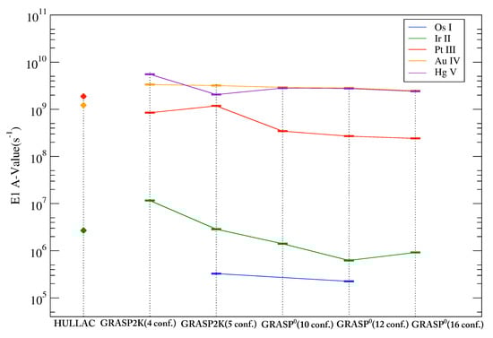 Transition probabilities for E1 vs. wavelength are plotted in Figure 2 for Figure 2a Os I, Figure 2b Ir II, Figure 2c Pt III, Figure 2d Au IV, and Figure 2e Hg V. The strongest transitions occur at shorter wavelengths, with most of them being shorter than 200 nm. We note that, while the bulk of the transitions are at UV wavelengths, the density of lines may make this wavelength range difficult to use for line identification. Observing at longer wavelengths, where the lines are more sparse, may provide opportunities for more definitive identification of the charge state of the ion (see below). The weighted transition probabilities (, where ), are compared with HULLAC calculations [8,25] and DESIRE [26] for Os I [28] and Ir II [27] in Table 6 and Table 7, respectively. There is reasonable agreement between GRASP2K and DESIRE, and GRASP2K and HULLAC calculations. The average percent difference of Os I is , and , and the average percent difference of Ir II is , and , between GRASP2K and DESIRE, and GRASP2K and HULLAC calculations, respectively. To illustrate the convergence of the A-values with calculation size, an electron dipole transition present in all ions was selected. The A-value for the various calculations is plotted in Figure 3, showing a reasonable convergence for all members of the iso-electronic sequence. The reason for choosing → transition is that for most of the ions in this paper, this transition has the strongest A-value, as shown in Table 8. DESIRE does not provide this transition. Increasing the number of configurations was observed to have a minor impact on the transition rates of the most highly ionized systems in the Os-sequence. However, near-neutral systems (e.g., Ir II) show slower convergence with respect to increasing numbers of configurations.