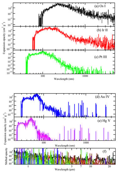 Expansion opacity at 1 day for 3700 K and 10 g/cm for (a) Os I, (b) Ir II, (c) Pt III, (d) Au IV, and (e) Hg V using GRASP2K calculations. The opacities in the IR are displayed in (f) for all ions but with their magnitudes shifted for comparison.