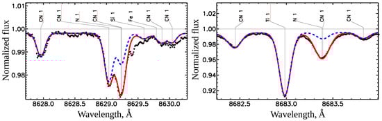 The abundances of CNO elements in stellar spectra are extremely important. They reflect many aspects of star formation and stellar evolution. Recent systematic observational and theoretical studies of planet formation have introduced new important aspects of stellar enrichment/depletion of these elements through their inclusion in dust particles (e.g., [,]). Differential depletion of certain elements in the accretion flow due to pebble migration in a circumstellar disk and its evolution throughout the lifetime of the disk may and probably does leave a subtle imprint on the relative abundances of the volatile versus refractory elements in stellar atmospheres. The differences between atmospheric abundances of the binary components are very small; therefore, advanced methods for measuring abundances with a precision of 0.03 dex or better are needed. Such methods have been proposed and implemented for carbon and oxygen. They use atomic lines, usually affected by deviations from local thermodynamic equilibrium (NLTE effects) in comparison with abundances derived from diatomic molecules (not subject to strong NLTE effects), such as CH and OH. Such techniques have become possible due to recent advances in atomic and molecular data that proved to be crucial for modeling the NLTE effects in atomic lines and improved the accuracy of the position and strength of individual transitions in molecular bands. For carbon and oxygen, the abundances derived from molecular lines are in excellent agreement with non-LTE analyses of atomic lines. For nitrogen, however, even for the sun, the molecular transitions give a 0.12 dex larger abundance than the atomic lines [,]. This is related to the fact that, for solar-like stars, atomic nitrogen has no convenient lines for the analysis comparable to the O i 6156–6158, 7771–7777, 8446 and 9260–9266 Å lines. For example, in the analysis of the nitrogen abundance, Amarsi et al. [] were only able to use four atomic lines in the 7400–8700 Å and one line in the near infrared region. Moreover, in the spectra of solar-like stars, practically all these lines are blended either with molecular CN lines or with atomic lines of other elements (see Figure 1), which requires accurate parameters for all contributing lines. Note, that for stars cooler than the sun, it is much more difficult to use N i atomic lines because they become weaker, while the CN blends become stronger. Even the molecular bands of NH are hard to reach as they are mostly located in the UV between 2300 and 3400 Å or in the infrared beyond 1.1 , while the spectra obtained for systematic abundance determinations typically cover the range of 3700–9000 Å or at least some parts of it.