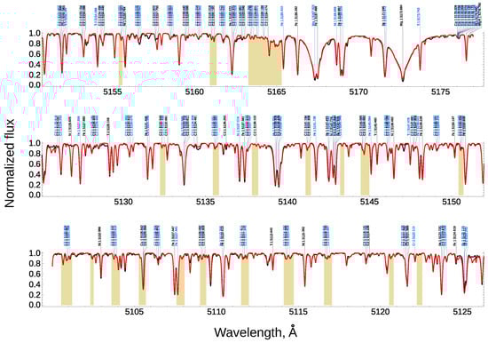 Spectral mask in the 5100–5200 Å region of the solar atlas. Observations are shown by the black line. The color bands highlight selected intervals. The sme fitting results are shown by the red line. Only 10% of the strongest transitions are marked on the plot.