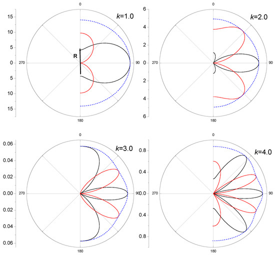The axis of the molecule is the polar axis in these figures. The 3D pictures of the differential cross sections are figures of rotation of the curves around the -axis. The dotted lines, which represent the sums of the partial cross sections, are not circles, as they would be in the case of spherical waves (1). The passage of the curves through the center of the polar coordinate system is associated with the zeros of the curves in Figure 2. The more frequent these zeros are, the more lobes on the curves of the cross sections and appear. Numerical calculations of the cross-sections using the optical theorem (Equation (7)), as expected, coincide with the total cross sections presented in Figure 3 by dotted lines.