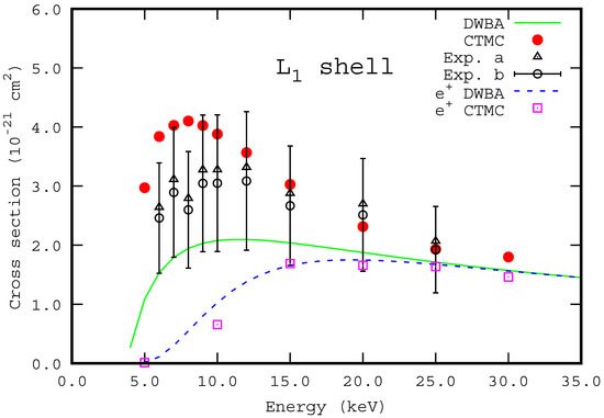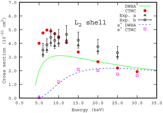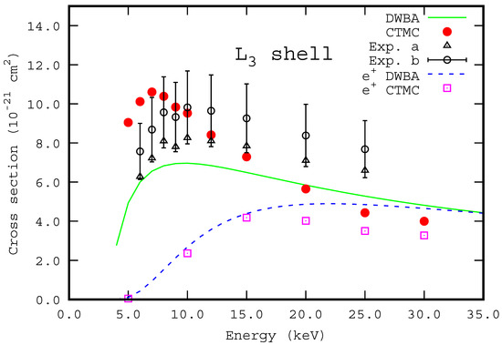 3-shell ionization cross sections are 30% higher at the same energy. All the theoretical values, including those by positrons, are in agreement with each other for energies higher than 20 keV. On the other hand, the experimental values are systematically larger than the theoretical ones.