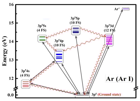 The required values of transition probabilities are taken from the NIST database [50]. The radius of the plasma chamber ( ρ ) is taken as 2.4 cm, and the gas temperature is equal to room temperature. We solve first the particle balance equation (Equation (1)) to obtain the population densities of different excited fine-structure levels of Ar. We have taken 42 fine-structure levels (i.e., x = 42 ). These levels are the ground state ( 3 p 6 ) and the excited configurations 3 p 5 4 s (with 4 FS), 3 p 5 4 p (with 10 FS), 3 p 5 3 d (with 12 FS), 3 p 5 5 s (with 4 FS), 3 p 5 5 p (with 10 FS) states, as well as the first ionization state of neutral argon, i.e., 3 p 5 . All of these states are given in Table 1 in the more familiar LS coupling notation, which we specifically derived for the purpose of the present work. Additionally, these were reported elsewhere in Paschen notation [36]. Table 1 also shows the electronic configuration of the different states and their energies [50]. All these considered levels are connected through different radiative and collisional transitions such as electron-impact excitation/de-excitation, ionization, diffusion, and three-body recombination, as shown in Figure 1. In the case of neutral argon, n + is the population density of Ar+ in Equation (1). The electron-impact excitation rate-coefficients are obtained using Equation (2) by employing RDW electron-impact excitation cross-sections calculated by our group [36]. In order to evaluate the ionization rate-coefficient, the required electron-impact ionization cross-sections are taken from the experiments [51,52]. The rate-coefficients for the diffusion of metastable states of Ar are taken from Kolts et al. [53]. It is worth mentioning that the escape factors required in Equation (1) are computed for the transitions which decay to the ground state of Ar, as only these have a significant contribution compared to other transitions.