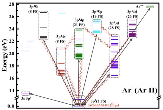 In the next step, we solve the particle balance equation (Equation (1)) to obtain the population densities of different excited fine-structure levels of Ar+. We considered 114 fine-structure levels (i.e., x = 114). These are 3 p 5 (ground state) and excited 3 s 3 p 6 , 3 p 4 3 d (with 28 FS), 3 p 4 4 s (with 8 FS), 3 p 4 4 p (with 21 FS), 3 p 4 5 s (with 8 FS), 3 p 4 4 d (with 26 FS), 3 p 4 5 p (with 19 FS) states as well as first ionization level of Ar+  3 p 4 . These considered levels are listed in Table 2, along with their electronic configurations and associated energies [50]. The CR model framework outlining the interconnection between FS levels via different radiative and collisional transitions is shown in Figure 2, such as electron-impact excitation/de-excitation, electron-impact ionization, and three-body recombination. Here, n + is the population density of Ar++ in Equation (1). The required RDW cross-sections of 114 fine-structure levels to evaluate electron-impact excitation rate-coefficient (Equation (2)) are taken from our previous work [38]. In addition, we have also calculated the additional RDW electron-impact excitation cross-sections of 3 p 4 4 s 3 p 4 4 p transitions because we did not report these cross-sections earlier [38]. These transitions play a vital role in the population and depopulation of the considered emission lines in the present work. The electron-impact ionization cross-sections of Ar+ needed to calculate the ionization rate-coefficients are taken from the reported measurements [54]. The required radiation trappings in Equation (1) are calculated for the transitions which decay to the ground state of Ar+, as we have found that only for these transitions, giving significant contributions.
