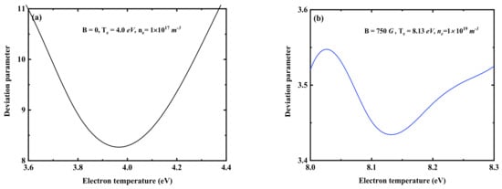 Using our CR models of Ar and Ar+, we have calculated intensities of their emission lines as mentioned above through Equation (7) at several combinations of T e and n e in the wide range. These calculations are performed separately at various plasma operating powers of 300, 600, 800, 900, and 1000 W. Thereafter, the deviation parameters are calculated using the intensities of Ar lines in ICP mode and Ar as well as Ar+ lines in Helicon mode through Equation (8). Further, these deviation parameters are plotted as a function of T e and n e in each mode at different powers. Then, we analyzed them to ascertain the minima to obtain the electron temperature and electron density values, which eventually characterize the plasma. As an illustration, the variation of the deviation parameter with respect to the electron temperature (at fixed n e , which we found corresponds to the minimum deviation parameter) at 1000 W for both the modes are shown in Figure 3. From this figure, we can see that for B ° = 0 (ICP mode), the minimum value of deviation parameter is found at 4.0 eV with n e = 1 × 10 17 m−3 and for B ° = 750 G (Helicon mode) at 8.13 eV with n e = 1 × 10 19 m−3. Thus, these values of the T e and n e , we can take as the extracted plasma parameters at 1000 W in different modes. It should be noted that in both cases, the minimum values of deviation parameters are less than 10 units. As explained earlier, the deviation parameter measures the agreement of the model intensities with the corresponding measurements [4]. Thus, 10 units can be said to as a good match of the intensities obtained from the CR model and experiment [4]. Similarly, we obtained the T e and n e values at all other powers for ICP and Helicon modes.