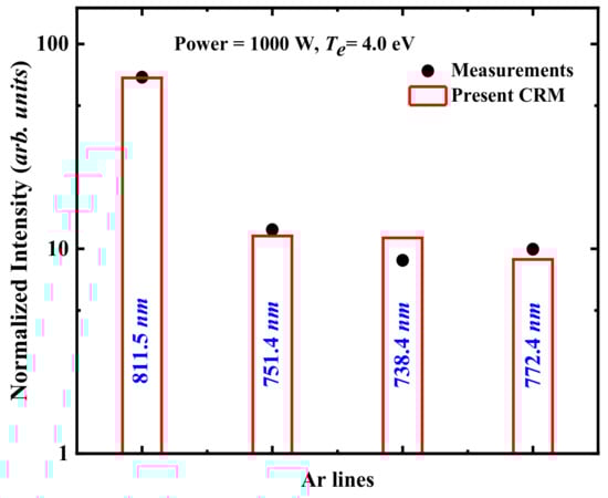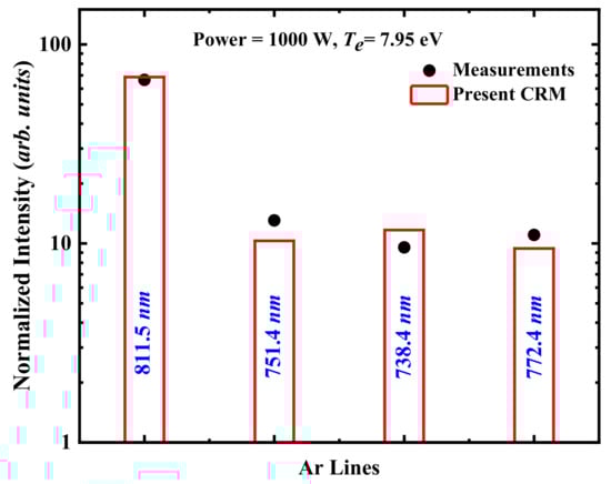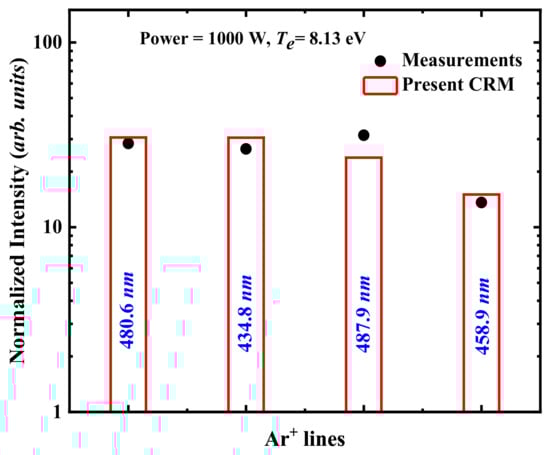 Furthermore, in Figure 6, Figure 7 and Figure 8, we have compared the normalized intensities obtained from the CR models (at the plasma parameters as given in Table 3) with the OES measurements [4]. In Figure 6 and Figure 7, we find that the intensities of the considered transitions of Ar show good agreement with the experimental results [4] within the 4%. The largest differences are observed for the spectral lines 738.4 and 772.4 nm. Further, in Figure 8, we observe good agreement for all considered emission lines of Ar+ with the experimental intensities [4]. The maximum difference was observed for 487.9 nm, which is 2%. Since the largest discrepancies are small in all three cases (Figure 6, Figure 7 and Figure 8), we can say that predictions from our CR model are quite reasonable. Consequently, the obtained plasma parameters ( T e and n e ) given in Table 3 at various powers are reliable.
