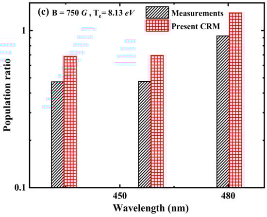 As population densities are the main output of the CR models through which we have calculated the intensities in different modes at various powers, it would be thus worth seeing how the population densities vary with respect to the experimental values, which we have obtained through the measured intensities [4] using Equation (6). For this purpose, in Figure 9, we plotted the ratio of upper-level population densities of the considered four emission lines in the present work, with respect to the wavelengths for the ICP and Helicon modes at 1000 W. To calculate this ratio, we divided all the upper-level population densities of the considered lines of Ar (738.4, 751.4, 772.4, and 811.5 nm) and Ar+ (434.8, 458.9, 480.6, and 487.9 nm) with the density corresponding to the largest wavelength among these lines in each case, i.e., 811.5 and 487.9 nm. The population densities with which the ratios are obtained are 3.24 × 1017 m−3 in ICP mode and 1.97 × 1017 m−3 and 1.17 × 1014 m−3 in Helicon mode. These are shown in Figure 9a–c, respectively. On comparing our results with the values obtained from measurements [4], we find a reasonable agreement between both sets of results for the ICP and Helicon modes at 1000 W.