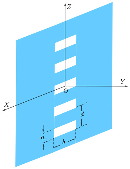 A diffraction grating with slits located in the x–z plane, a and b are the slit dimensions and d is the period of the grating.
