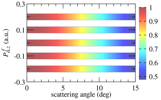 In the case of ionization, discussed in subsection III.B, the restrictions on the accuracy in measuring the momenta follow from the inequality (). If we suppose that the electron momenta can be measured with much better accuracy than those of the recoil ion (like, e.g., it is the case with cold target recoil ion momentum spectroscopy (COLTRIMS) techniques [35]) then the uncertainty will be determined by the condition which can be quite severe ( a.u. in the example considered in Figure 3). The spectrum shown in Figure 3 follows from the cross-section (10) which was obtained by integrating over the components and of the target recoil ion. Therefore, there is no such restriction on the accuracy of measuring these momentum components. Additionally, since the components and of the momentum transfer in the collision do not enter the term in Equation (10) determining the interference pattern in Figure 3 (note that this also remains true in calculations employing the continuum-distorted-wave eikonal-initial-state approach), there are also no strict restrictions on the accuracy of measuring these components in an experiment.