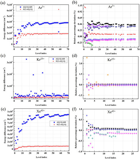 Furthermore, in Figure 2a, the difference between the RSCF and RCI energies is presented for Ar, Kr and Xe to demonstrate the influence of Breit corrections, QED effects and nuclear recoil correction with increasing nuclear charge. Their effects are clearly seen to be most significant for xenon. The energies are improved by a maximum of 33,797 cm for Xe. The largest difference of around 8000 cm between the RSCF and RCI energies is found in Kr, whereas for Ar, it is only 250 cm. Overall, the increasing role of RCI calculations in heavy ions is affirmed by this study.