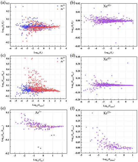 In the present study, the accuracy of the E1 transition parameters is determined using two approaches. The first accuracy estimator is to check the discrepancy between the S values from the velocity () and length () gauges. Figure 3a,b show the comparison between the log and log values in Ar, Kr and Xe. It is quite evident that the results from the two gauges are in good agreement for all the three ions.