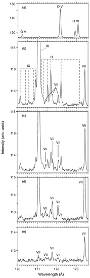 Spectra recorded on EBIT-I in the spectral range 170.0 to 173.6 Å: (a) Line emission from O V and O VI transitions; (b–e) line emission of Fe VII – Fe IX recorded at a nominal electron beam energy of (b) = 170 eV, (c) = 130 eV, (d) = 110 eV, and (e) = 90 eV.