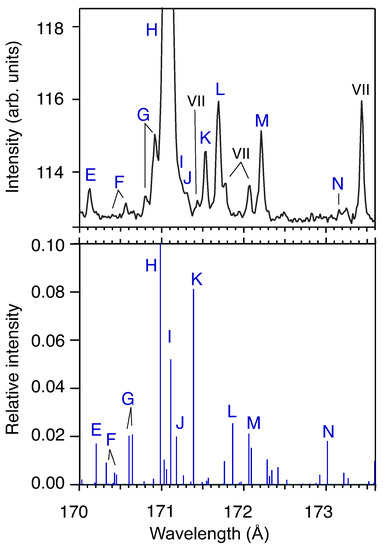 The iron spectra in Figure 1b–e illustrate the appearance of new lines as the beam energy threshold for the production of new charge states is crossed. At a nominal electron beam energy = 90 eV, only lines from Fe VII are visible in the spectrum (Fe VIII lines are not found in this wavelength interval, but they are monitored at wavelengths below 164 Å). As the beam energy is raised by 20 eV to = 110 eV, the strongest Fe IX line (at 171 Å) already dominates the spectrum. At = 130 eV the intensity of the Fe IX line increases even further and new lines, all attributable to weaker Fe IX lines, populate the spectrum. Finally, at = 170 eV, eleven Fe IX features, in addition to the strong Fe IX line at 171 Å can be identified in the spectrum. These features are labeled by capital letters E through M in Figure 2, in keeping with the labeling scheme used in [12], although labels F and G refer to more than one feature, as described below and given in Table 1.