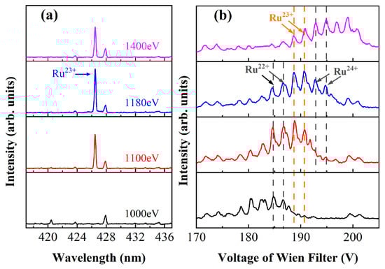 We take the Ru as an example to introduce the procedure briefly. The charge state distributions of Ru ions along with the line intensity are measured at four electron energies as shown in Figure 1. As illustrated in Figure 1a, the line around 426 nm appears when the electron energy exceeds the ionization threshold of Ru. Moreover, the line intensity shows an increasing tendency with the CSDs of Ru ions (see Figure 1b). As a result, this line is classified as an emission line from Ru ions.