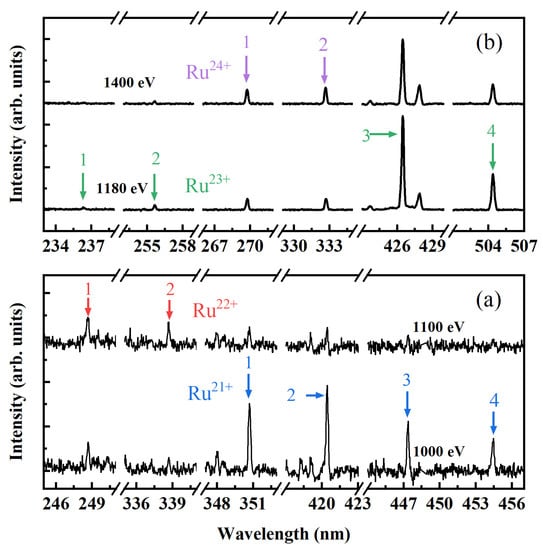 Observed spectra of Ru–Ru ions. (a) Lines of Ru, Ru at 1000 and 1100 eV, (b) lines of Ru, Ru at 1180 and 1400 eV. The lines labeled with arrows represent the transitions with highest intensity from different ions.