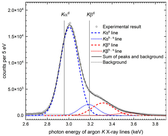 The spectrum of argon K X-rays recorded by the Si(Li) detector are shown in Figure 1. The weight center positions of the argon Kα and Kβ diagram transitions, Kαd and Kβd, at 2.957 keV and 3.191 keV, are indicated by the vertical lines, respectively [22]. The clear shift of the experimental peaks to higher energies indicates high ionizations of the argon atoms. The energy intervals between the Kαs, Kαh,s, Kβs, and Kβh,s peaks are close to the resolution of the detectors (~180 eV) [23]. The origin of the Kαs, Kβs satellite and Kαh,s, Kβh,s hypersatellite peaks is described in detail in our previous paper [15]. The Kαs, Kβs satellite and Kαh,s, Kβh,s hypersatellite peaks come from the transitions of the following types: , , , and , respectively.