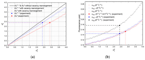 The relationship between and with and without considering the vacancy rearrangement process, is shown in Figure 2a. In the figure, the experimental data are also shown (denoted by horizontal and vertical dashed lines). The experimental is obtained by averaging the data at the observation angles (90°and 145°). It can be seen that is significantly smaller in the case which considers vacancy rearrangement than the case which does not consider vacancy rearrangement. This means that a part of the L-vacancies is filled by electrons in higher levels before the K X-ray emission during the vacancy rearrangement process. The for the Kαh,s radiation is larger than that for the Kαs radiation if they have the same initial . This is due to the fact that the K-shell is filled faster for the double K-vacancies than for the single K-vacancy.