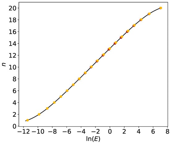 Once the energy eigenvalues have been calculated, they can be used to find the phase shifts , e.g., for s-wave scattering. This assumes that the target is spherically symmetric and states have zero total angular momentum. The method used by Gribakin and Swann in [] is implemented here. Firstly, the eigenvalue problem is solved for a free particle, i.e., using a chosen basis-state expansion but neglecting the interaction between the projectile and the target in . The free-particle energy eigenvalues are denoted and increase monotonically with n. Hence, it is possible to introduce an invertible function such that
