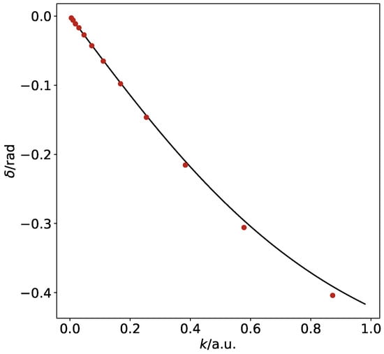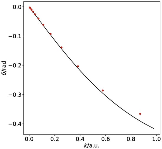 Positron–hydrogen s-wave scattering phase shifts in the static approximation. Red data points: phase shifts obtained using the present variational method. Black line: data obtained by solving the radial Schrödinger equation using the suite of codes described in [].