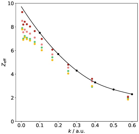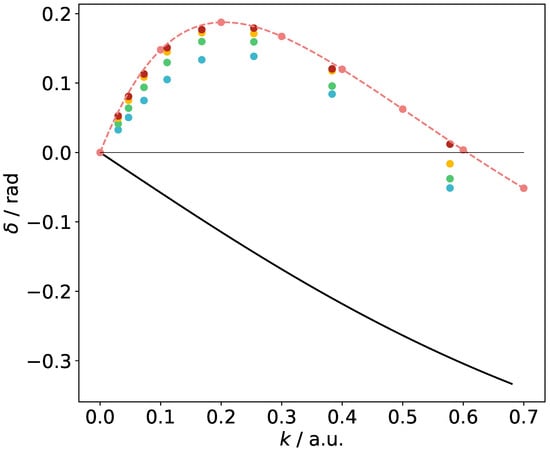 Positron–hydrogen s-wave scattering phase shifts obtained using various numbers of terms with in the wavefunction (colored circles, blue: one term, green: three terms, yellow: five terms, red: nine terms). Details of the parameters used in each wavefunction can be found in Appendix B. Pink circles are the Kohn variational calculations of Humberston et al. [], which are connected by the dashed line to guide the eye. The black solid line is the result of the frozen-target approximation.