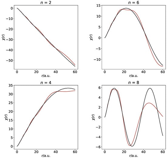 In Figure 8, the eigenfunctions obtained using the present method are divided by A and multiplied by , and they are compared to the true continuous-spectrum radial function obtained by solving the radial Schrödinger equation [] and normalized as