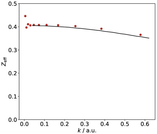 Figure 9 shows the corresponding frozen-target values and compares them with those obtained using true continuous-spectrum positron states in the same approximation [,]. Apart from some “noise” related to inaccuracies in the calculation of the normalization constant A at low energies, there is a good general agreement between the two sets of results.
