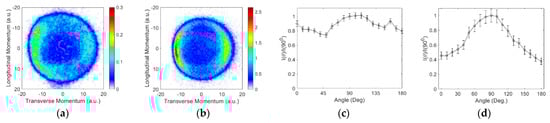 Momentum images obtained for the ions from (a) aniline at 4.7 eV and (b) benzylamine at 5.5 eV. The incoming electron beam direction is from top to bottom; (c,d) are the respective angular distributions.