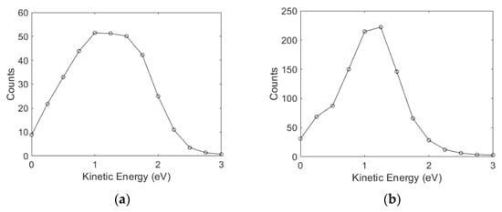 Kinetic energy distribution of the ions obtained from (a) aniline at 4.7 eV and (b) benzylamine at 5.5 eV electron energy.