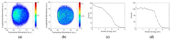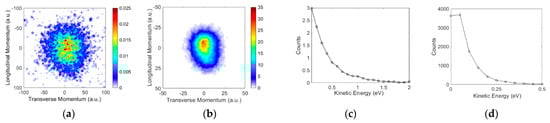 Momentum images obtained for the ions from (a) aniline at 9.6 eV and (b) benzylamine at 5.5 eV. The incoming electron beam direction is from top to bottom; (c,d) are the respective kinetic energy distributions.
