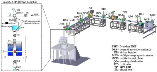 - Andelkovic, Z.; Herfurth, F.; Kotovskiy, N.; König, K.; Maaß, B.; Murböck, T.; Neidherr, D.; Schmidt, S.; Steinmann, J.; Vogel, M.; et al. Beamline for low-energy transport of highly charged ions at HITRAP. Nucl. Instrum. Methods Phys. Res. Sect. A 2015, 795, 109–114. [Google Scholar] [CrossRef]