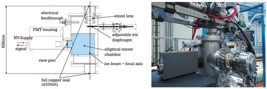 Since the SPECTRAP experiment was originally only foreseen for high-precision laser spectroscopy in a penning-trap, it needed to be equipped with an optical detection region (ODR) dedicated for collinear laser spectroscopy []. The ODR implemented at SPECTRAP was the prototype of the optical detection region for collinear laser spectroscopy at CRYRING@ESR. It was mounted in a vertical direction above the SPECTRAP magnet, as indicated in the left panel of Figure 1 and in more detail in Figure 2, where picture of the mounted setup is also shown in the right panel. Inside the vacuum, an elliptical mirror system made of aluminum plates (MIRO 3 by Alanod) is held by a frame made of PEEK and insulated against the conducting walls of the vacuum chamber. The more distant focal axes of the mirror system are aligned with the laser and ion beam axis. The second focal axis is close to the quartz window, on which a photomultiplier tube (PMT) of type 9235QB from ET Enterprise Ltd. with a dark count rate of ∼ is mounted outside the vacuum. Due to the elliptical design, fluorescentlight originating from the excited ions is accumulated more efficiently than scattered light originating from different locations along the beam line. Apertures of 20 mm diameter in the lower and upper back planes of the ODR provide sufficient space to overlap the laser and ion beam inside the ODR. Electrostatic quadrupoles in front of the 90-bender and an einzel lens after the bender were used to optimize the ion beam shape inside the interaction region. Full copper seals with a central bore of 10 mm diameter below and above the interaction region ensured a proper alignment of the ion and the laser beams. The laser position was additionally monitored by a camera above the exit window and could be optimized using a movable iris diaphragm.