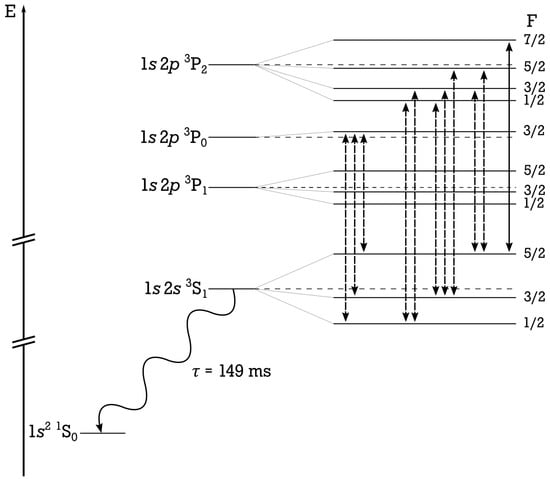 - Drake, G.W.F. Theory of Relativistic Magnetic Dipole Transitions: Lifetime of the Metastable 23S State of the Heliumlike Ions. Phys. Rev. A 1971, 3, 908–915. [Google Scholar] [CrossRef]
