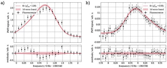 All spectra were taken by recording the optical resonance fluorescence as a function of the laser frequency which was tuned across the resonance line. Collinear spectra could only be recorded for the  of the 11B3+ hyperfine-multiplet, due to the reduced S/N ratio in this geometry. This line therefore served as a reference line and its transition frequency was measured in collinear–anticollinear geometry. All other transitions, indicated by dashed lines in Figure 3, were investigated only in anticollinear geometry. Spectra of the reference line obtained in anticollinear and collinear geometry are depicted in Figure 4a,b, respectively.
