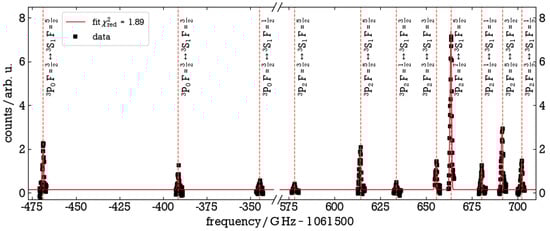 All other hyperfine lines were measured relative to the reference transition in anticollinear geometry. For these cases, the following procedure was used: the temporally closest measurement of the reference transition  in combination with the rest-frame transition frequency  from Equation (6) was used to eliminate the ion velocity in Equation (4). Hence, the measured laboratory frequency  of a hyperfine transition x was transformed into the rest-frame according to