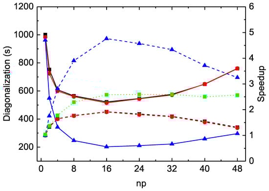 As mentioned above, the total CPU times for diagonalization reported in Table 2 and Table 3 (see rows labeled “Sum(SetH&Diag)”) are dominated by the first diagonalization, as the initial radial functions are taken from the converged calculations. In SCF calculations initialized by Tomas–Fermi or screened Hydrogenic approximations, more computation efforts have to be devoted to subsequent diagonalization during the SCF iterations. It is obvious that the limited MPI performance for diagonalization is the bottleneck in rmcdhf_mpi_FD calculations. As seen in Table 2 and Table 3 and Figure 3a and Figure 4a, more CPU time is required if np exceeds the optimal number of cores for diagonalization, which is generally in the range of 16–32. In rmcdhf_mpi and rmcdhf_mem_mpi calculations, the inefficiency of the orbital-updating procedure is another bottleneck, though this limitation may be alleviated by using more cores to perform the SCF calculations. However, this kind of alleviation would be eventually prohibited by the limited MPI performance of diagonalization. As seen in Table 3 and Figure 4a for the rmcdhf_mpi and rmcdhf_mem_mpi calculations, the walltimes with are longer than those with , though the CPU times for updating the orbitals are still reduced significantly in the former calculation.