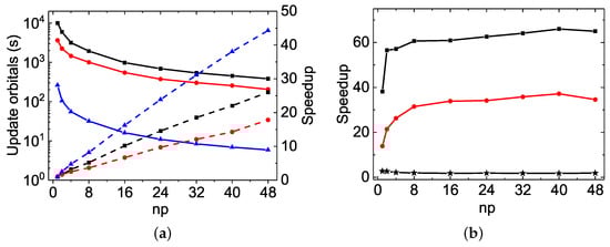 In rmcdhf_mpi_FD, the above inefficiency is removed by using the binary search strategy from the sorted arrays NXA(:,a) and NYA(:,a), and this code benefits from some other improvements, as discussed in Section 3.2. As seen in Figure 5a and Figure 6a, the speed-up factors for updating the orbitals increase slightly along with and attain the value of about 22 for both the and rmcdhf_mpi_FD calculations with , while the corresponding reductions for the code running times are, respectively, 12.5 and 22.5, as seen in Figure 5b and Figure 6b. It should be mentioned that in the rmcdhf_mpi and rmcdhf_mem_mpi calculations, the “Sum(SetH&Diag)” CPU time values are all less than the “Sum(Update)” ones, as seen in Table 4 and Table 5. However, it is the opposite for the rmcdhf_mpi_FD calculations, with all “Sum(SetH&Diag)” CPU time values still larger than the “Sum(Update)” ones, as in Mg VII calculations. Comparing to rmcdhf_mpi, the code rmcdhf_mpi_FD reduces the CPU times required for updating the orbitals by a factor lying in the range of 38–20, with = 16–48 for the MCDHF calculations, while for the calculations, the corresponding reduction factors are in the range of 242–287. The corresponding reduction factor ranges for the code running times are, respectively, 11–4.7 and 54–22.5, as seen in Figure 5b and Figure 6b. One can conclude that the larger the scale of the calculations, the larger the CPU time reduction factors. Moreover, the lower the number of cores used, the larger the reduction factors obtained with rmcdhf_mpi_FD. These features become highly relevant for extremely large-scale MCDHF calculations if they have to be performed using a small number of cores due to the limited performance of diagonalization, as discussed in the above section.