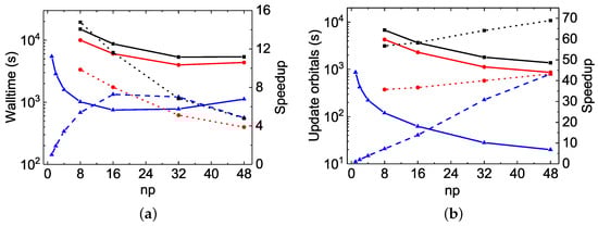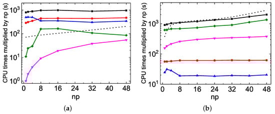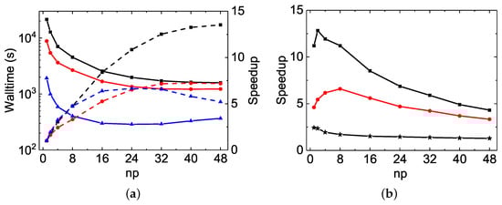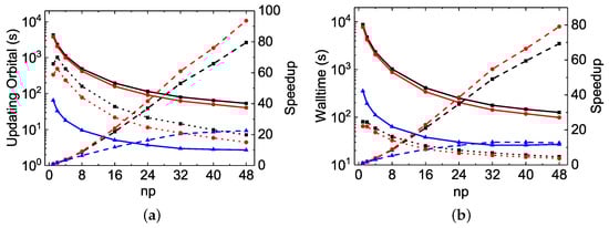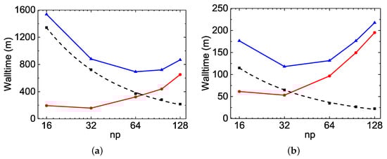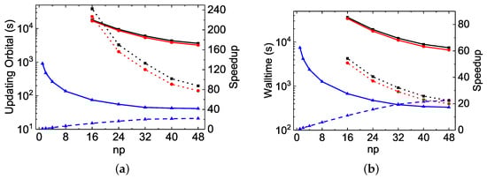 The MPI performances for the “walltimes” are different from each other among the three codes. As seen in Table 2 and Table 3, the orbital updating CPU times are predominant in most of the rmcdhf_mpi and rmcdhf_mem_mpi MPI calculations, whereas the diagonalization CPU times dominate in all rmcdhf_mpi_FD MPI calculations for all np values. Hence, as seen in Figure 3a and Figure 4a, the global MPI performance of rmcdhf_mpi_FD is similar to the one achieved for diagonalization. The maximum speed-up factors are, respectively, about 6.6 and 7.3 for the and calculations, both with = 16–32, though the “Update” CPU times could be reduced by factors of 44 or 43 with , as shown above. The speed-ups increase along with np in the rmcdhf_mpi and rmcdhf_mem_mpi calculations, being, respectively, about 13.5 and 7.2 with . As shown in Figure 3b, comparing to rmcdhf_mpi, the walltimes are, respectively, reduced by a factor of 11.2 and 4.3 in rmcdhf_mpi_FD calculations using and , while the reduction factors are, respectively, 15 and 4.8 for the calculations, as shown in Figure 4a. The corresponding speed-up factors of rmcdhf_mpi_FD relative to rmcdhf_mem_mpi are smaller by a factor of 1.5, as rmcdhf_mem_mpi is 1.5 times faster than rmcdhf_mpi, as seen in Figure 3b.