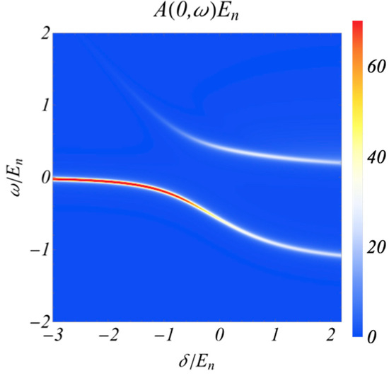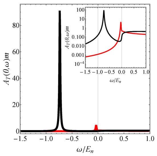 The features of the scattering matrix in Equation (7) can be read from Figure 1. Figure 1 shows the spectral function of defined as as a function of for (red) and (black). For clarity, we show the spectral function for the same parameters in logarithmic scale. The scattering matrix is formed by a sharp and real pole at the energy of the bound state (narrow peak) and a continuum of excitations at only visible in the inset. As is increased from large negative values, the bound state becomes well-defined leading to a sharper pole.