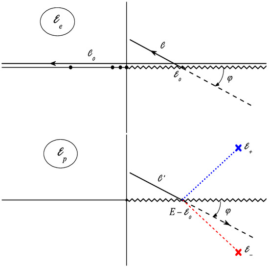 The contour goes from ∞ to just above the real axis in the electron complex energy plane . The bound-state poles of are shown by filled circles. The integration path in Equation (22) is obtained by a negative angle rotation of , about some point on the positive real axis. is the image of the rotated contour on the proton energy plane . The unitarity branch cuts of and are depicted by the zigzag lines. The symbols × show the superfluous poles in the matrix elements of the proton Green’s function calculated in the basis (13).