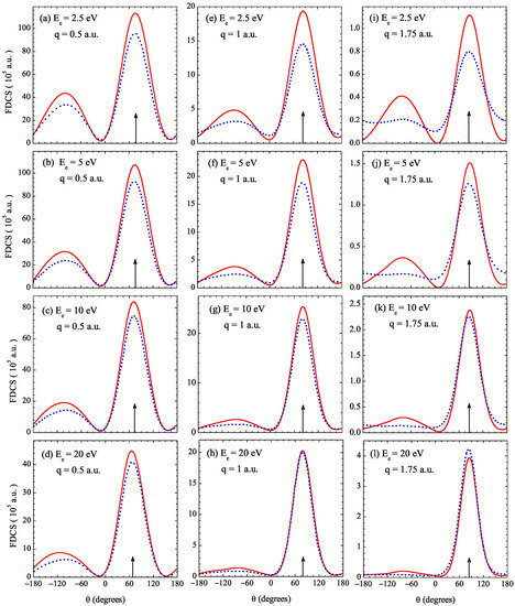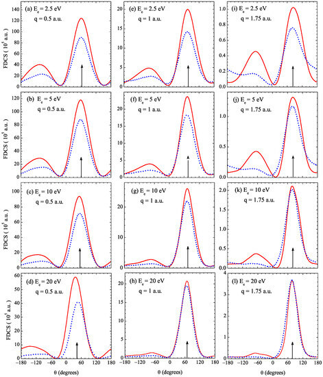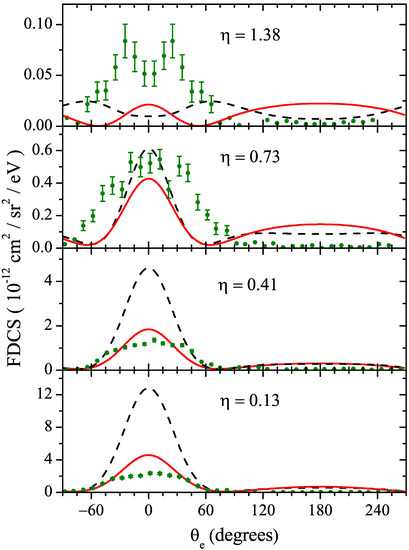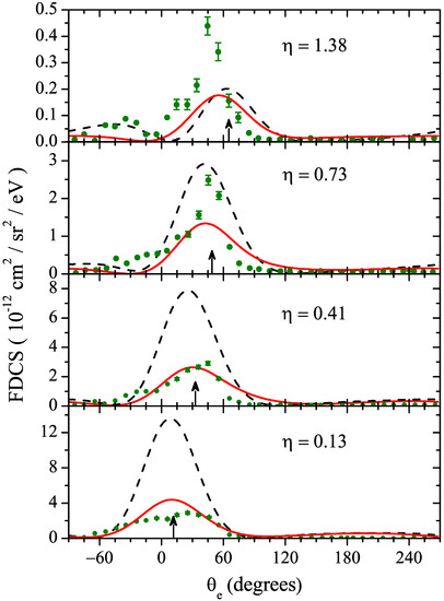 One can observe that, for all the cases, both the experimental FDCS and the theoretical ones (see also [16,18,19,20,21]) in the scattering plane exhibit a strong peak near the direction of the momentum transfer (indicated in each panel by the arrow). At the same time, the theoretical prediction for the binary peak position is shifted towards smaller angles relative to the experimentally observed value for all momentum transfers, except for .