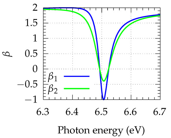 Note that the dipole asymmetry parameter is now written as under the quadrupole approximation. The expression for differs from only in the term in the denominator of Equation (9). With the inclusion of non-dipole interactions, . In general, the dipole amplitude dominates the quadrupole amplitude. It can be, therefore, easily seen that this additional term in only plays a major role when the dipole amplitude goes through a minima. We again transform the representation of from :