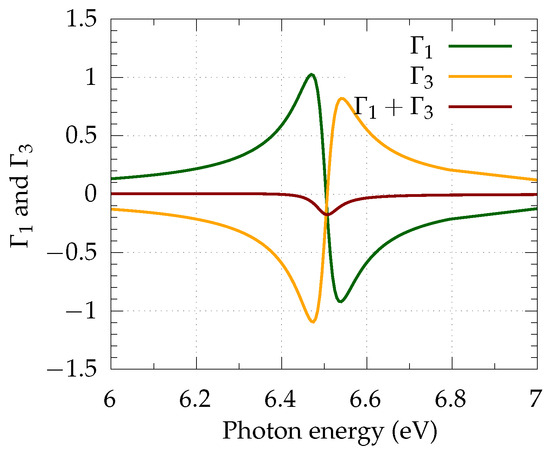 In the electric dipole approximation, . The ℓ values in the Wigner 3j symbols, and , of Equations (4) and (5) range from to , giving and 2. The summations begin from for the second term and for the third term of Equation (3). Hence, under the dipole approximation, ℓ only takes values 1 and 2. In this particular case, the variable in Equations (4) and (5) is an even number (), because is given by , which is zero. Since ℓ is odd and is even, the only term that needs to be considered in Equation (4) is the one that involves the electric and magnetic interactions. However, in the dipole approximation, magnetic interactions do not appear and, hence, . Therefore, only contributes in the dipole approximation giving rise to and . The Wigner 3j symbols of Equations (4) and (5), and give and , respectively, for and . Using and along with Equation (3), Equation (2) reduces to