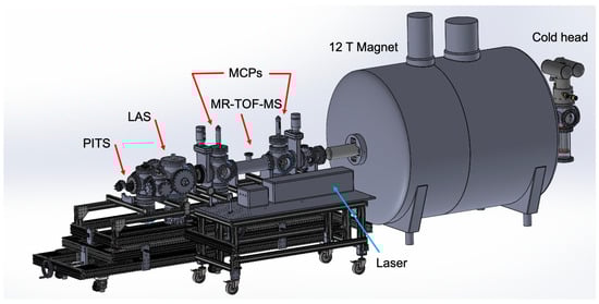 CAD drawing of the CHIP-TRAP apparatus. The main components include a Penning ion trap source (PITS), a laser ablation source (LAS), microchannel plate (MCP) detectors for ion beam detection, a multi-reflection time-of-flight mass separator (MR-TOF-MS) for separating ions of different nominal , a 12 T superconducting magnet that houses the Penning traps, and a cold head for cooling the traps down to 4 K.