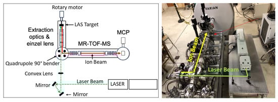 A LAS requires a high-powered pulsed laser that is focused to a small spot size (typically ≤1 mm diameter), which provides a power density of ∼ W/cm to enable ablation. For a standard nanosecond pulse length laser, this corresponds to an energy density of ∼0.1–1 J/cm. The high energy density laser pulse causes the evaporation of material from the surface of the target followed by ionization due to the high temperatures that are generated. The CHIP-TRAP LAS uses a Continuum Surelite II frequency-doubled 532 nm pulsed Nd:YAG laser [], which has a 5 ns pulse duration and energy output of up to 160 mJ at 532 nm. A schematic and picture of the CHIP-TRAP LAS are shown in Figure 2.