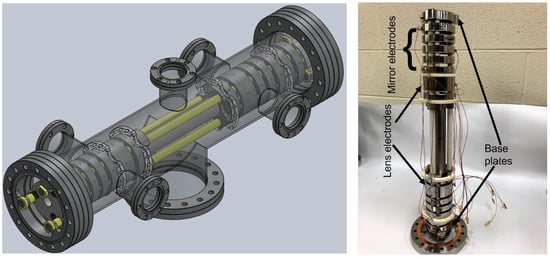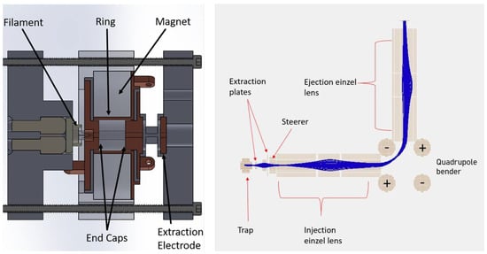 At Central Michigan University, we developed a so-called Penning ion trap source (PITS) that produces ions via the electron impact ionization of gaseous samples [,]. The ionization occurs inside a cylindrical Penning trap. Hence, the ions are automatically confined in a small volume after production and can be released as a pulsed beam. A cross-sectional view of the PITS is shown in Figure 3 (left).