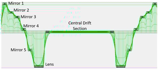 In order to admit and trap ions, the “in-trap potential lift” scheme is used []. The ion beam is transported toward the MR-TOF-MS with an energy of ≈1 keV. A cylindrical lift electrode located before the entrance to the MR-TOF-MS is quickly switched from −1 kV to 3 kV when the ion bunch enters it. At this time, the central drift tube is raised from ground to 2.8 kV. Hence, the ions then enter the MR-TOF-MS with enough energy to pass the +3 kV mirror electrode at the entrance to the MR-TOF-MS. When the ions reach the center of the central drift tube, its potential is lowered to ground, reducing the energy of the ions so that they then become trapped in the MR-TOF-MS potential. The ions are confined for a certain number of cycles as required by the user and then released by again raising the potential of the central drift tube to 2.8 kV when the ions are at the center of the tube, and traveling toward the ejection end of the MR-TOF-MS. The ions can then pass over the ejection Mirror 1 electrode. After they exit the MR-TOF-MS, they enter another cylindrical lift electrode that is held at 3 kV and lowered to −1 kV to reduce the ion beam’s energy back to the 1 keV transport energy. The ions are then focused onto an MCP for TOF analysis. We plan to use a Bradbury–Nielsen gate (BNG) [] to allow the ions of a particular to pass and be injected into the magnet bore toward the Penning traps, and to remove unwanted ions from the beam.